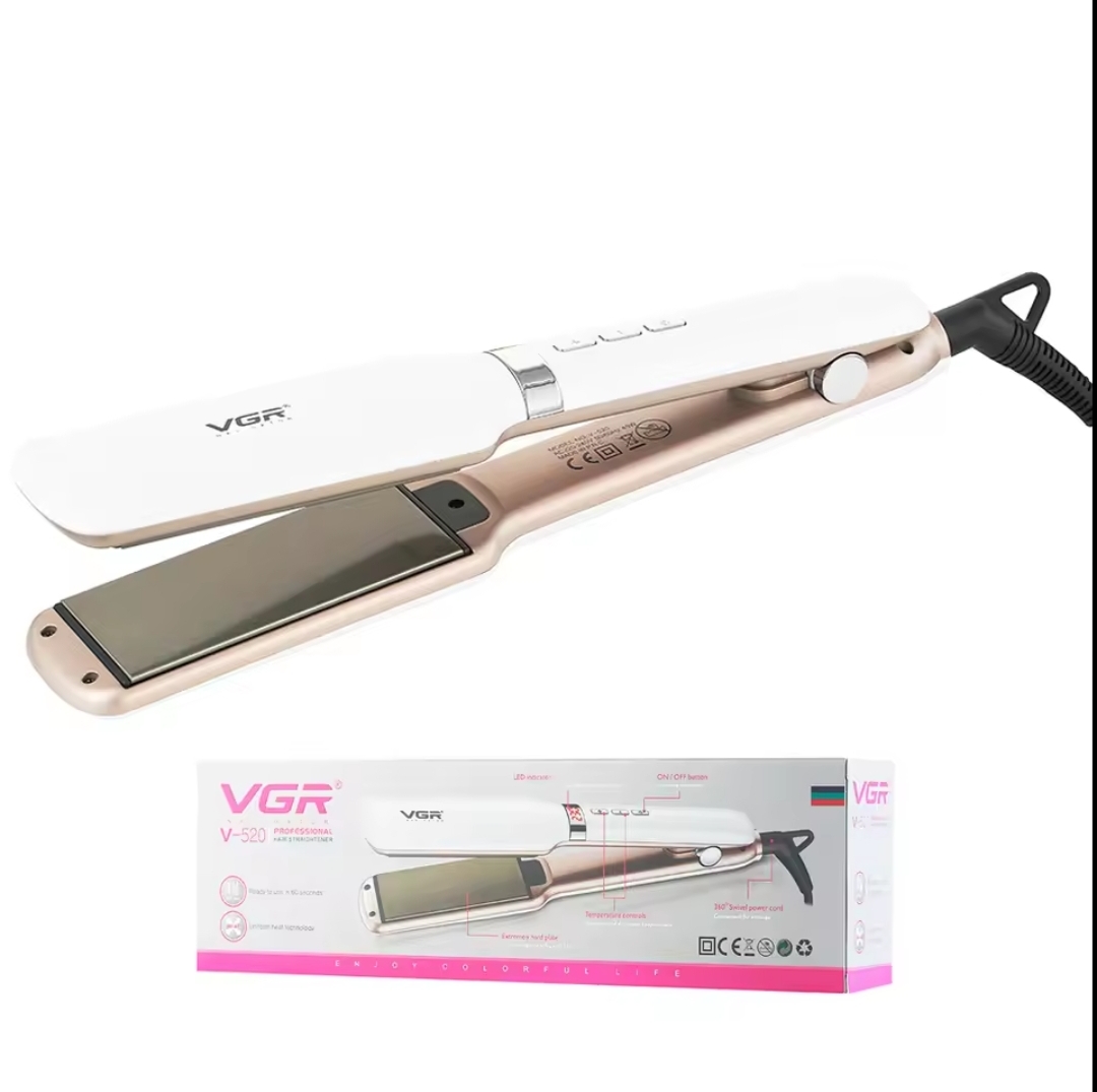 اتوی موی وی جی آر مدل V-522 یک اتو موی کاملا حرفه ای با کیفیت بالا و دارای بدنه ای از جنس ABC که فوق العاده محکم می باشد و در اثر ضربات فیزیکی احتمالی مقاوم است، این اتو مو با آخرین تکنولوژی های روز دنیا تولید شده که دارای صفحاتی از جنس سرامیک بوده و به مو های شما هیچ گونه آسیبی وارد نمی کند، زیرا در صفحات حرارتی، حرارت به صورت پراکنده پخش می شود.اتو موی وی جی آر V-522 دارای صفحه ی نمایشگر دیجیتالی بوده که میزان دما را نشان می دهد و محدوده ی دمای آن از150تا 230درجه ی سانتی گراد قابل تنظیم می باشد، شما با این میزان حرارت میتوانید موهایتان را کاملا صاف و براق کنید، سیم این اتو مو دو متر بوده و در قسمت وصل شده به بدنه قابلیت چرخش ۳۶۰ را دارد این این باعث آزادی عمل بسیار زیادی برای شما می شود. از این اتوی مو هم برای استفاده ی شخصی و هم برای سالن های آرایشی می شود استفاده کرد زیرا باعث صرفه جویی در زمان شده و سرعت عمل آرایشگران را بالا می برد چون در کمتر از ۳۰ ثانیه کاملا گرم شده و قابل استفاده می باشد همچنین این دستگاه دارای حلقه آویز بوده و طول عمر بسیار زیادی دارد.محصولات وی جی آر دارای کیفیتی اروپایی و مورد تایید استاندارد اروپا CE می باشد.