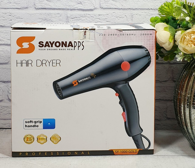 سایونا برند نام آشنا در تولید محصولات با کیفیت برقی است.یکی از این محصولات با کیفیت سشوار سايونا 2000 وات مدل SY-1000 GOLD است. این محصول با بهره گیری از موتور AC دارای قدرت پرتاب باد بسیار بالایی است و در دسته سشوار های حرفه ای قرار میگیرد.روی دسته این محصول 3 دکمه تعبیه شده که آنها تنظیم حرارت سشوار و سرعت دمیدن باد را به عهده دارند به این صورت که یک دکمه جهت ایجاد باد سرد به طور لحظه ای است. یک دکمه 3 حالت بدون حرارت، حرارت کم و حرارت زیاد را انجام میدهد. یک دکمه هم تنظیم 3 حالت باد خاموش، سرعت کم و سرعت زیاد را به عهده دارد.همچنین درون بسته بندی سری متمرکز کننده وجود دارد.